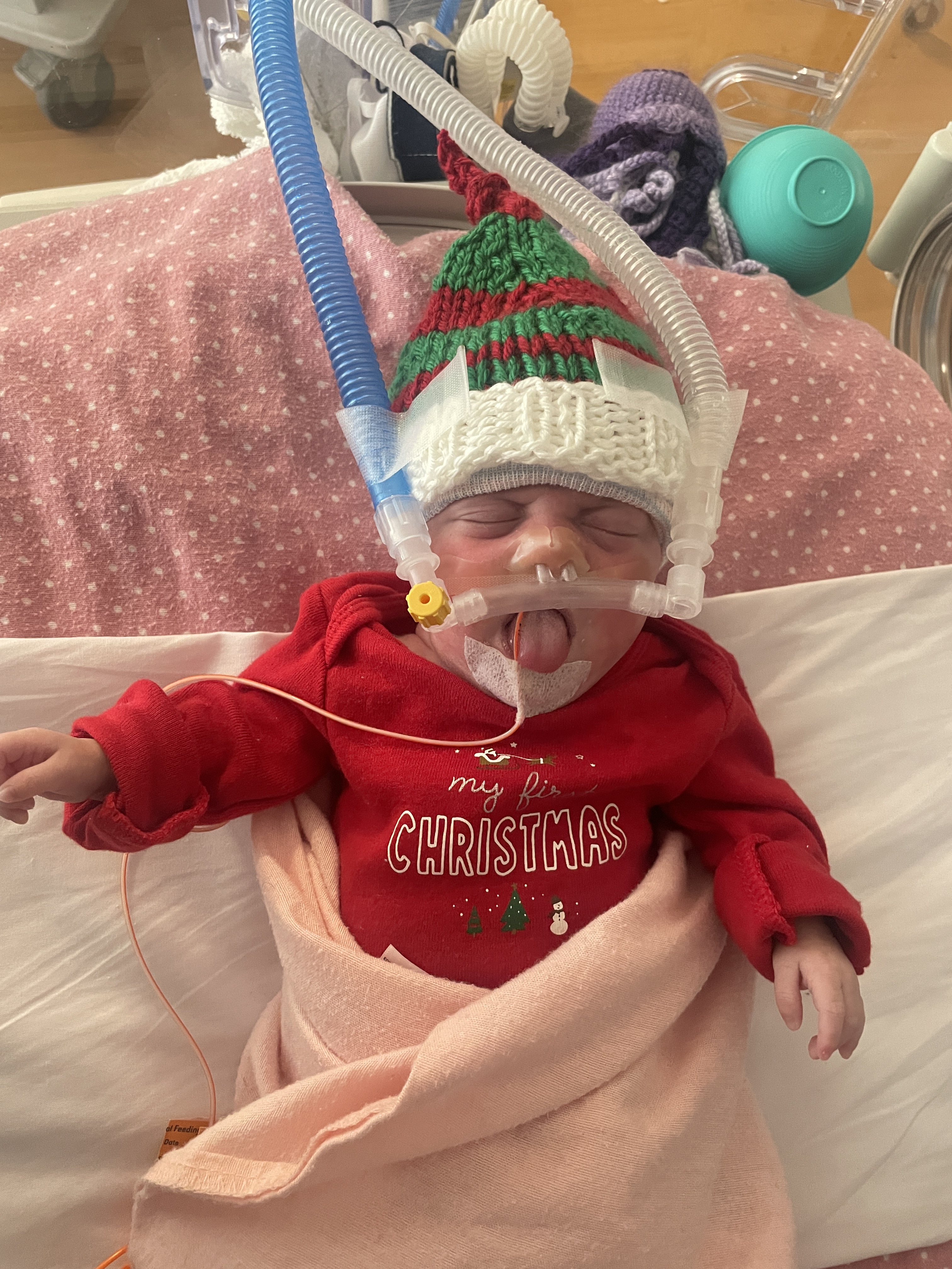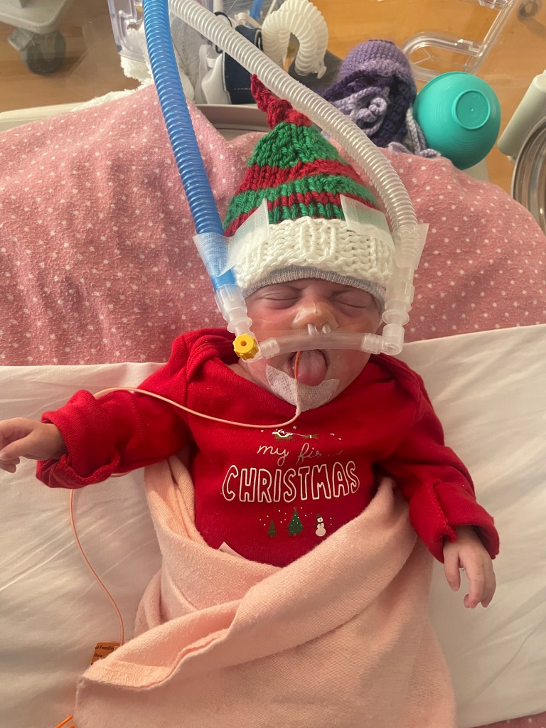 Here is our very own Christmas Elf. The beanie she is wearing was made by one of the doctor’s mother. So nice of her to make them for all the babies in the NICU.