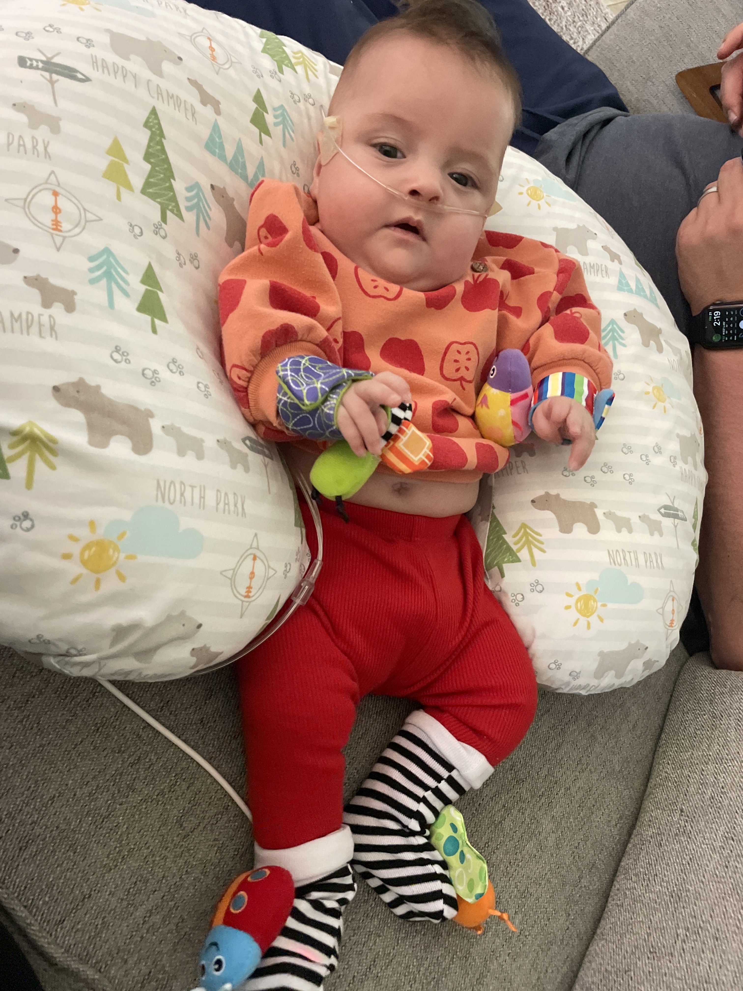 Our biggest challenge with Olivia is eating. She was champion eater before we left the hospital but at home she has not been the same. It has definitely been discouraging in many ways. We want the best for Liv. We want her to grow and then we worry about dehydration. We have tried lots of things, different bottles, different formula, different positions, etc and nothing seems to impact it. These last couple of days we have tried going up in nipple flow and that has actually been helping. We are getting closer to what the daily goal is. We had an appointment with speech on Friday, and we learned that it is around three months where the instinct to suck stops and babies need to want to suck on their own. That has helped us understand why sometimes it takes awhile for her to start to suck and why it seems like she gets frustrated. We will continue to try all the things and just pray that she continues to improve without any other health issues. With our visit to the pediatrician on the 28th he did say we could start to try food! So we started with some pureed apples. She’s not sure how she feels about them, but she did eat some. Today we tried pureed carrots. She seemed to like those a little more. Or maybe she is getting to used the new consistency.