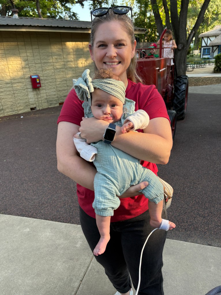 Olivia’s eating has still been a little bit of a challenge. She is eating more but not consistently. When we took her to the pediatrician on April 24, she had only gained 3 oz in a month. So while she didn’t lose weight, she didn’t gain as much as expected. On a positive note, her length is growing great. We have an appointment with a dietician through outpatient pulmonology next week, so my guess is we will add more calories (more powder) to her bottles.